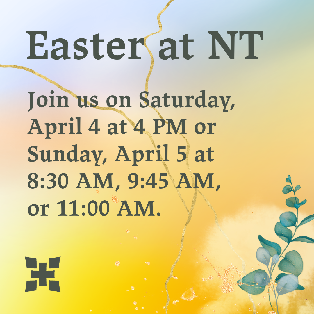 {Tag Friend's Name Here}, we are having four different in-person Easter Services at North Terrace this year and I would love to have you join me at one! Our four, In-Person Easter services, are on Saturday, April 4 at 4:00 PM and Sunday, April 5 at 8:30 AM, 9:45 AM and 11:00 AM. Would one of those times work for us to attend together? More information about the services is available at ntcoc.org/easter